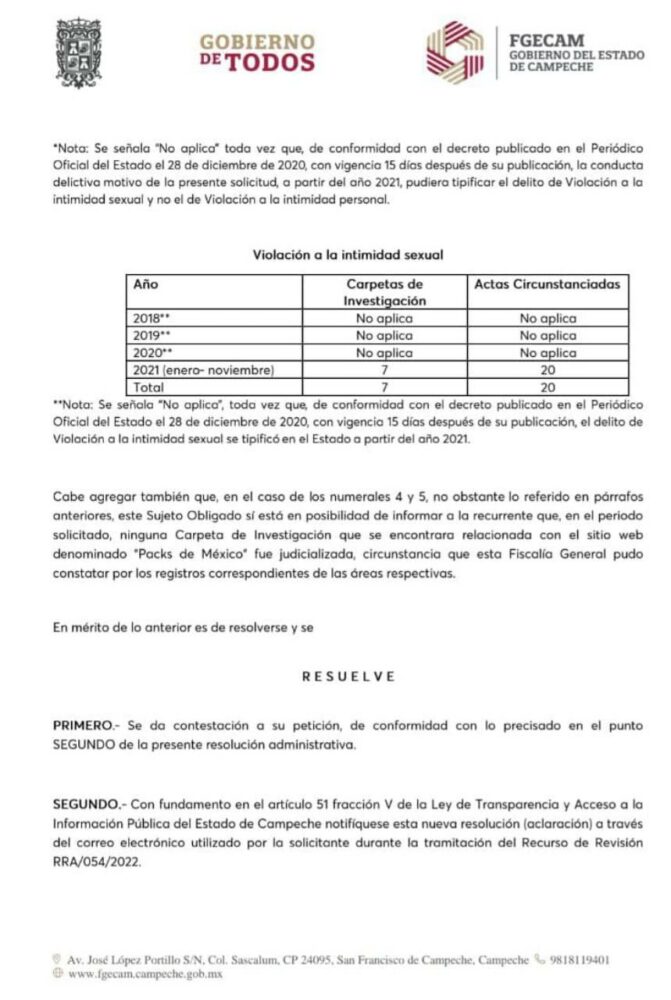 En el 2020, la Fiscalía General del Estado de Quintana Roo recibió la primera denuncia contra el portal Packs de México. El delito de violencia digital aún no estaba tipificado en el Código Penal de esa entidad. Se encuadró, según sus características, en violación a la intimidad personal.
