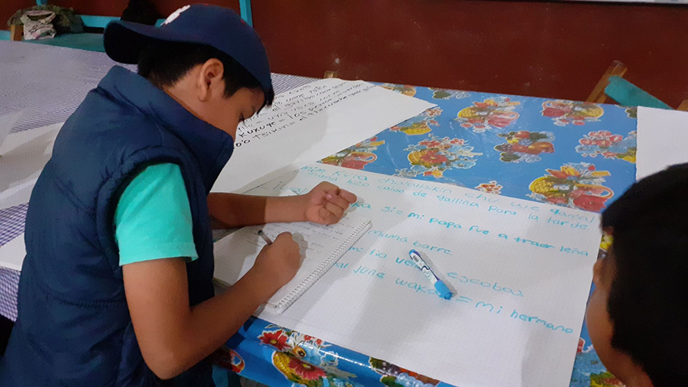 Erick Emmanuel Roblero Ramos es uno de los estudiantes con más alegría del grupo. Se la pasa recorriendo el gran pasillo de la Casa. A sus 10 años de edad, llega al curso acompañado de su abuelo Don Carlos Ramos.
