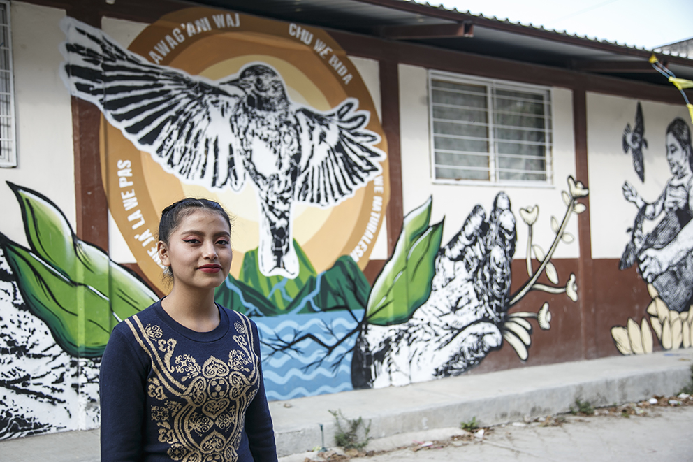 En la otra parte del mural, Greydi Ramos Pérez, de 11 años, es una niña participante en el curso. Ella también fue modelo en la actividad artística. Con honestidad y nerviosismo, mencionó no conocer la historia de los mochó, sólo sabe que es algo que hacen los ancestros, pero que adora llegar a la fiesta en honor San Francisco, disfrutar del puzunque y el frijol con chipilín, sin olvidar la danza de los moros.