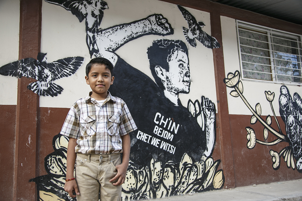A Erick no le cuesta desenvolverse y es participativo. En una actividad artística, se ofreció como modelo de un mural que se encuentra en la parte exterior de la Casa. Junto a colibríes y nopales, Erick porta una camisa con la leyenda “Ch´in bejom Chet we witsi”, cuya traducción es “Niño caminante de la montaña”.