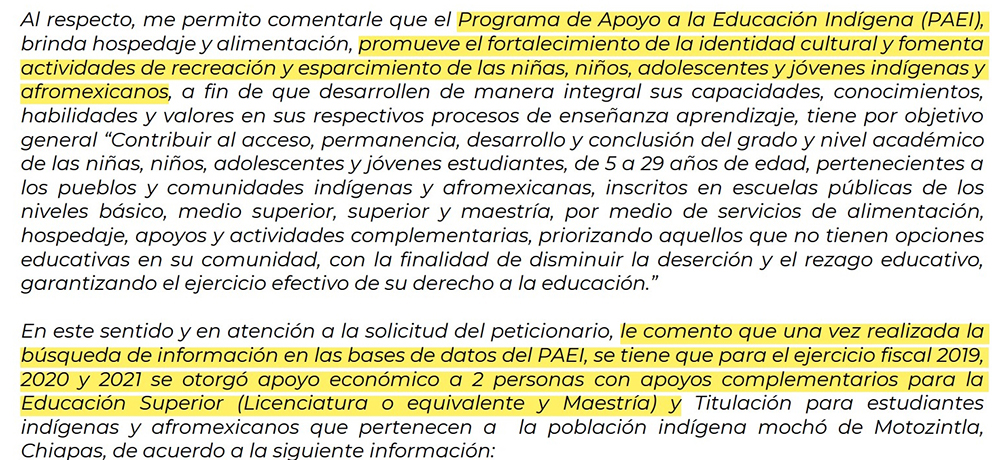 Por su parte, el Instituto Nacional de los Pueblos Indígenas (INPI), por vía solicitud de información, se le preguntó sobre lo mismo que a la Secretaría de Educación Federal durante el presente sexenio. Dicha petición, fue canalizada a las Coordinaciones general de derechos indígenas y, de patrimonio cultural y educación indígena.