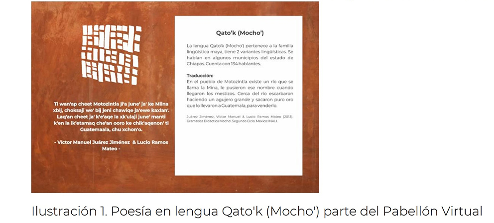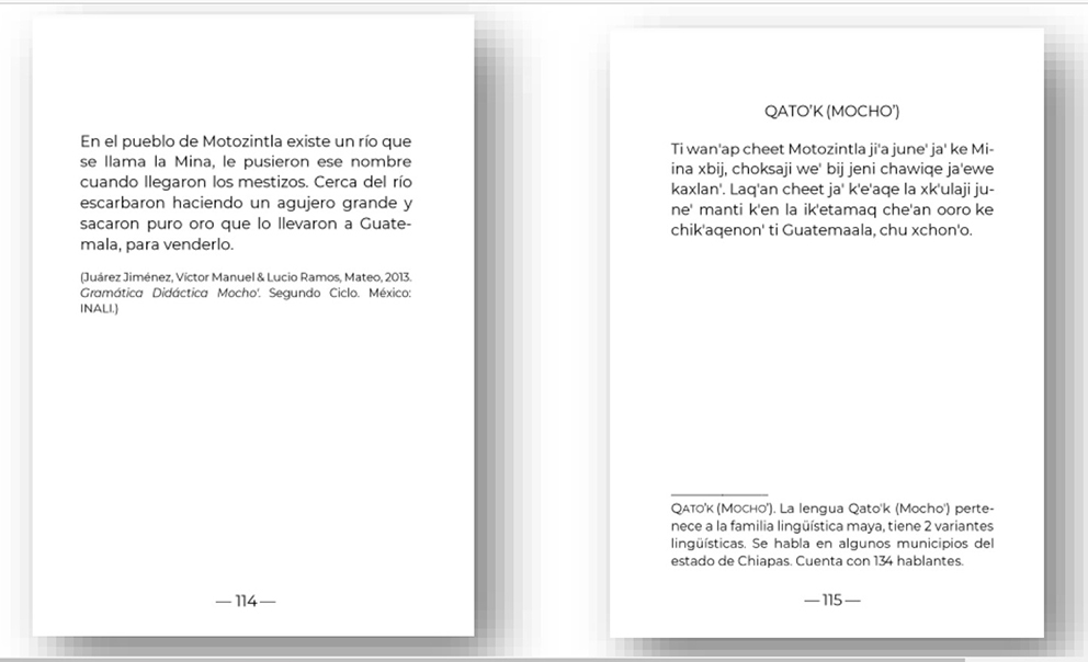 Por último, se le preguntó al Instituto Nacional de Lenguas Indígenas de la Secretaría de Cultura las mismas acciones emprendidas hacia la población mochó. Su respuesta fue recordar la presencia en el Pabellón de las lenguas indígenas para las ferias internacionales del libro de Oaxaca y de Guadalajara 2019, una pared con un teto hecho por Víctor Manuel Juárez Jiménez y Lucio Ramos Mateo, también publicado en una antología denominado Paisaje Lingüístico de México. paisaje-linguistico-mexico-1.pdf (cultura.gob.mx)