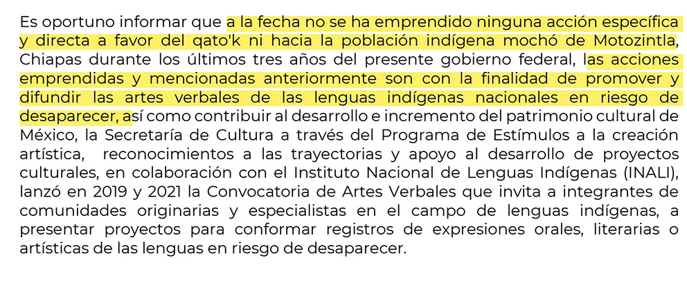 Tal vez, INALI sea la institución gubernamental que más se ha acercado a apoyar directamente a los mochó. Según la solicitud de información, en febrero del 2020 el INALI invitó a participar a don Teodoso Ortíz Ramírez, como Guardián de la Palabra Mocho’ (qato’k) en el Congreso Internacional de Lenguas en Riesgo y en el Evento de Alto Nivel convocado por la UNESCO.