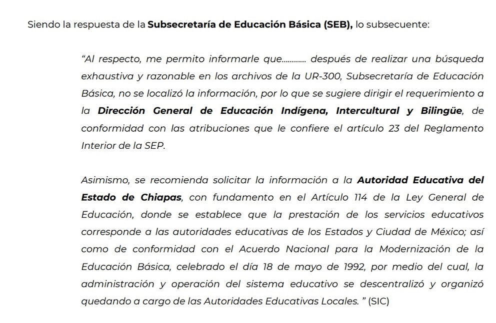 En primera, dicha petición fue remitida a la Subsecretaría de Educación Básica, quien a su vez condujo a la Dirección General de Educación Intercultural Bilingüe (DGEIIB) para realizar dicha encomienda. La respuesta fue la siguiente: