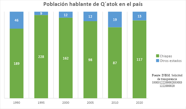 Según el INEGI, los hablantes han disminuido su presencia paulatinamente desde 1990. En 30 años, se redujo la población hablante de 189 a 117 personas en Chiapas, es decir, disminuyó 38 por ciento; mientras que, en el resto del país, la situación es más grave, pasó de 46 a 13 hablantes, un decremento del 72 por ciento.