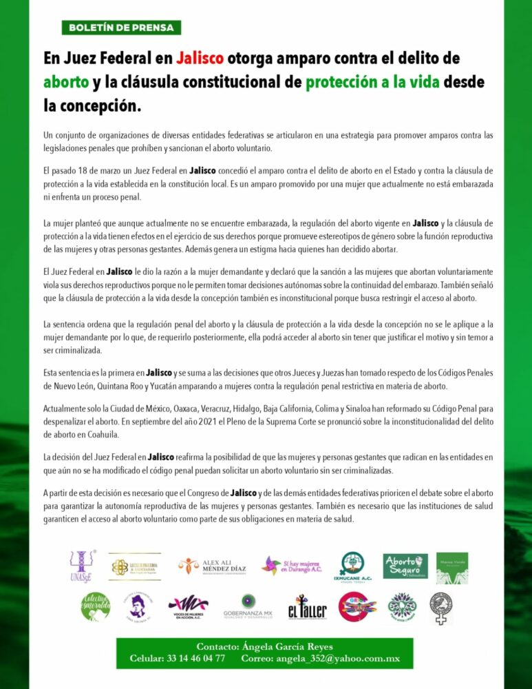 Como un antecedente histórico en Jalisco, el pasado 18 de marzo, un Juez Federal otorgó a una mujer un amparo contra el delito de aborto y la clausula constitucional de protección a la vida desde la concepción, ambas disposiciones contendidas en el Código Penal estatal.