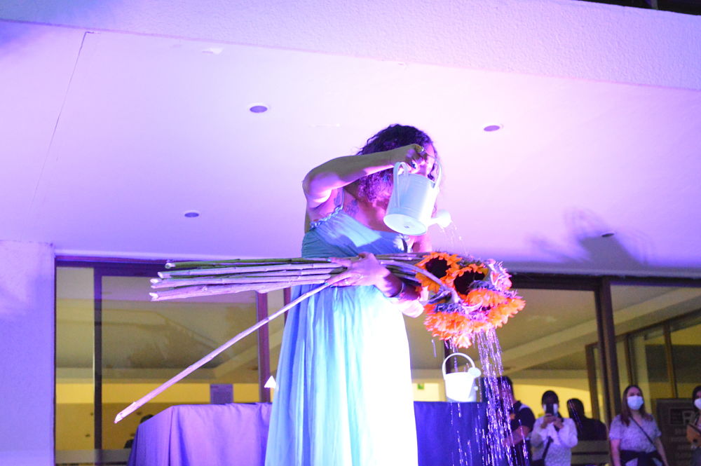 Antes de la presentación, con un vestido azul y un ramo de girasoles en la mano la artista Lía “La novia sirena” llevó a cabo la acción artística “Ternura trans”, en las escaleras del Foro y Arte y Cultura.