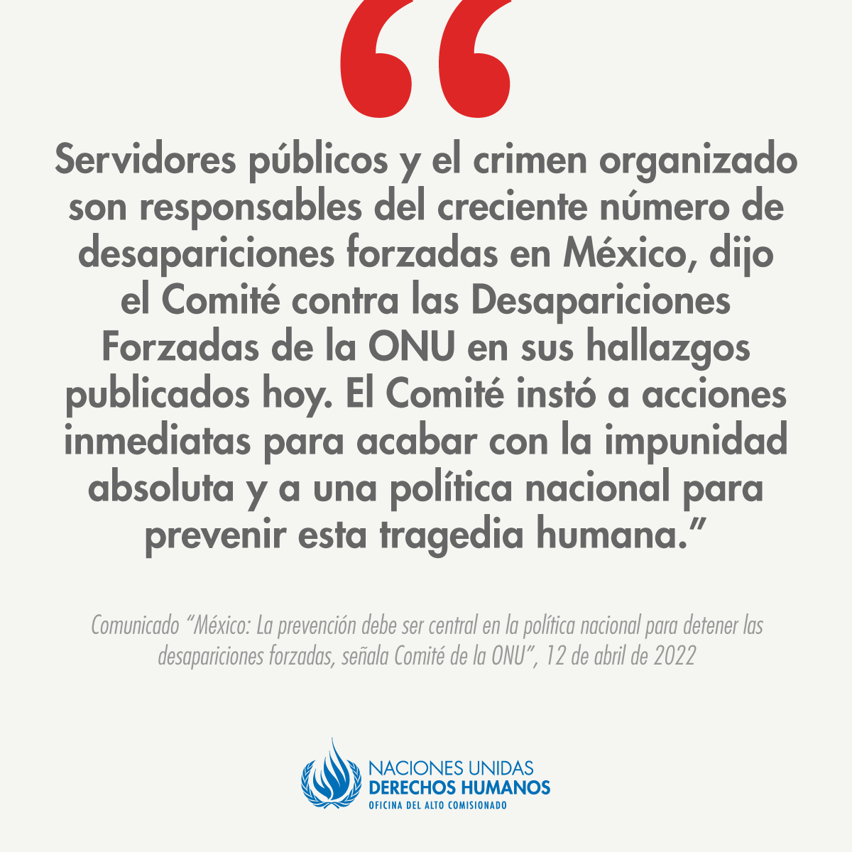 “La impunidad en México es un rasgo estructural que favorece la reproducción y el encubrimiento de las desapariciones forzadas y pone en peligro y causa zozobra a las víctimas, a quienes defienden y promueven sus derechos, a los servidores públicos que buscan a las personas desaparecidas e investigan sus casos y a la sociedad en su conjunto”, denunció el Comité.