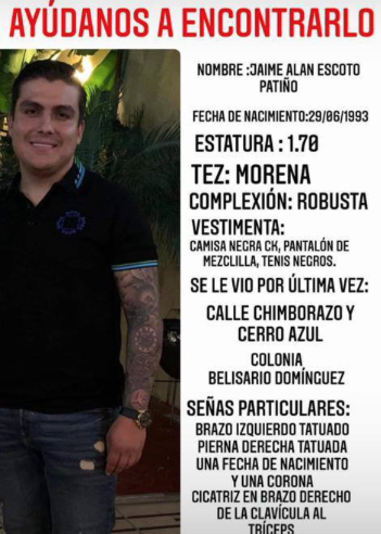 Jaime Alan Escoto Patiño, de 28 años, fue desaparecido de manera violenta, el 19 de marzo de 2022, cuando fue bajado de su auto en el el cruce de las calles Chimborazo y Cerro Azul, en la colonia Belisario Domínguez, en Guadalajara.
