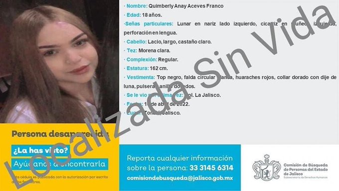 En Jalisco, de acuerdo al Registro Nacional de Personas Desaparecidas y No Localizadas, del 1 de enero al 24 de abril de 2022 se ha denunciado la desaparición de 91 mujeres; de éstas la Fiscalía del Estado de Jalisco asegura que ha localizado a 79 víctimas, 77 con vida y, lamentablemente, dos sin ella: Quimberly Anay Aceves Franco y una mujer reportada como desaparecida y localizada sin vida en el municipio de Tamazula de Gordiano.