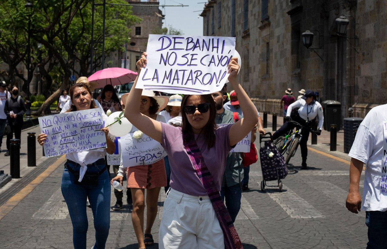 Con pancartas y consignas donde exigen al Gobierno del Estado y la Fiscalía de Jalisco resultados para dar con los responsables del feminicidio de Quimberly Anay Aceves Franco, familiares y amigo marcharon sobre la avenida Juárez al Palacio de Gobierno de Jalisco donde exigieron a las autoridades avances en las investigaciones.