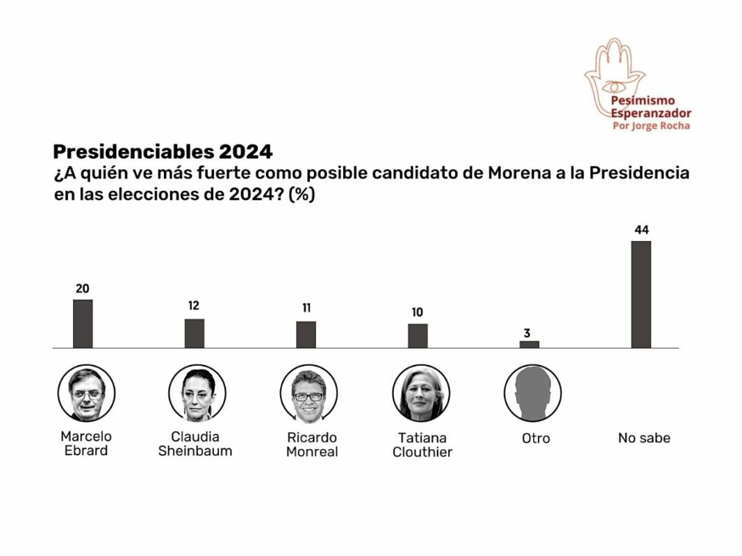 Ahora bien, cuando se pregunta por la preferencia electoral de Morena como partido o de los dos candidatos punteros, en las encuestas aparece que entre el 45 y el 50% de las personas votarían por el partido del presidente; y Sheinbaum y Ebrad tienen alrededor del 30% de las preferencias electorales. Esto significa que no hay una transferencia directa de la aprobación del presidente a su partido o a sus candidatos, ya que quedan sueltos entre 10 y 15% en el caso de Morena y el 30% en lo que respecta a Ebrard o Sheinbaum. Esto significa que no todas y todos los que apoyan al presidente, apoyan a Morena o a alguno de sus precandidatos. Aquí estriba entonces el gran reto para este partido político, lograr una clara identificación del presidente con su posible sucesora o sucesor.