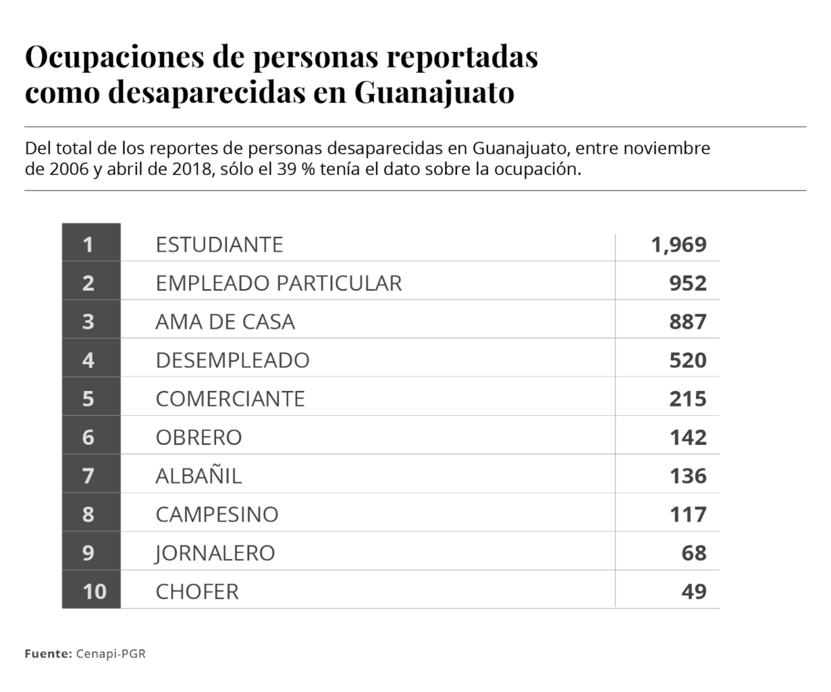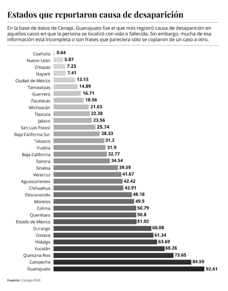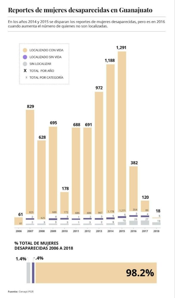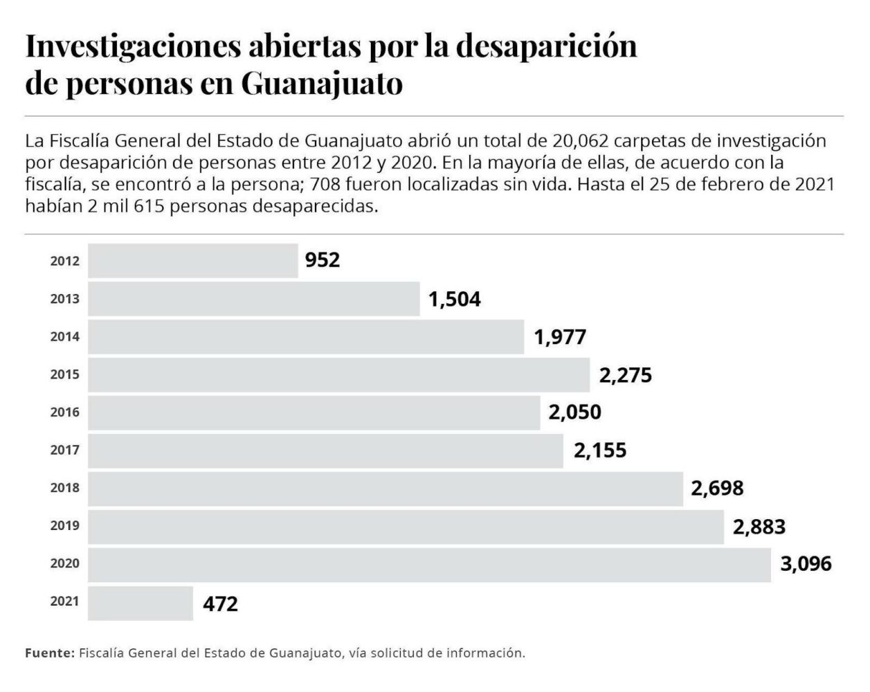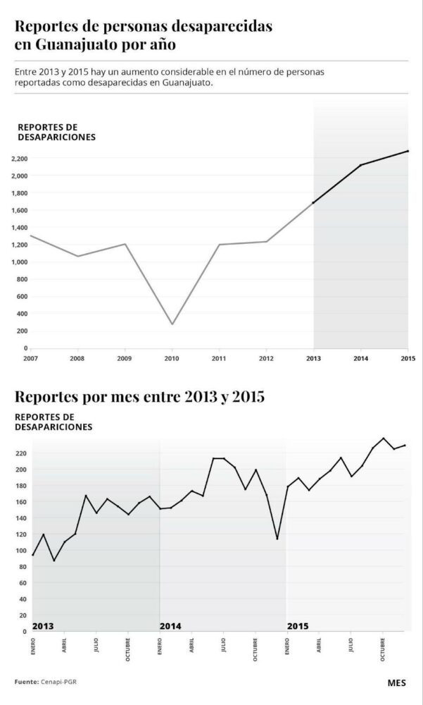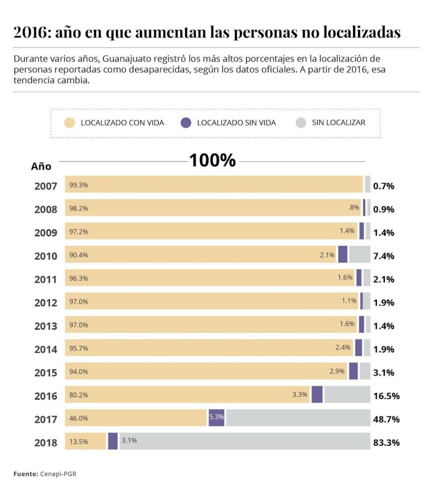 Entre 2007 y 2017, Guanajuato fue el estado con más reportes de personas desaparecidas y no localizadas, aunque a más del 93% se le localizó con vida. Esto comenzó a cambiar desde 2016, cuando aumentó el número de quienes ya no se encontraban y surgieron indicios de que la base de datos estaba maquillada. La crisis de desaparición que hoy vive el estado comenzó a tejerse tiempo atrás