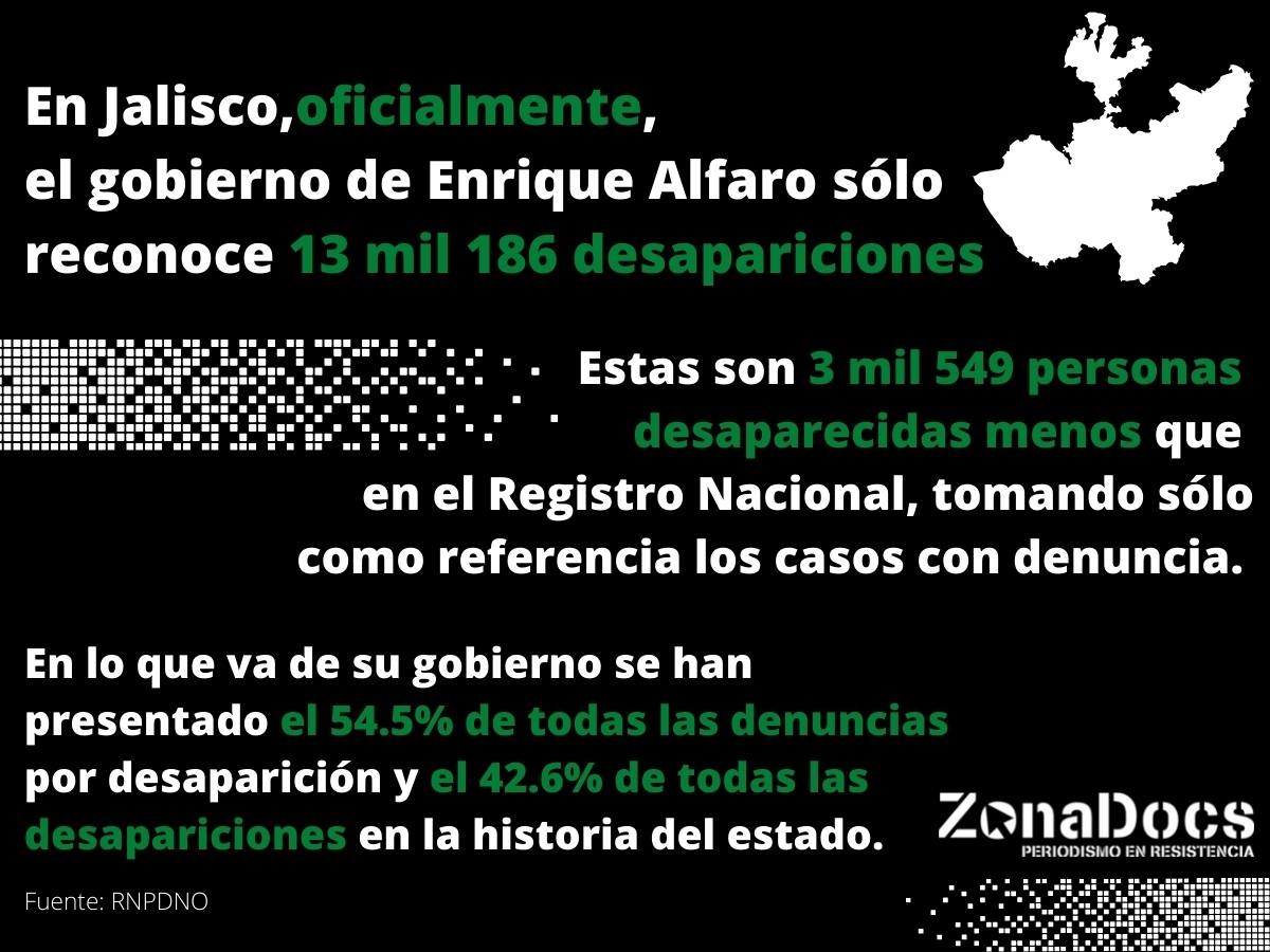 De todas estas denuncias presentadas, el número de personas que siguen desaparecidas es de 14 mil 954, esto conforme al Registro Nacional de Personas Desaparecidas y No Localizadas; de éstas, 6 mil 377 personas fueron desaparecidas durante la gestión de Alfaro Ramírez, lo que significa que su gobierno concentra el 42.6% de todos los casos de desaparición en la historia del estado.