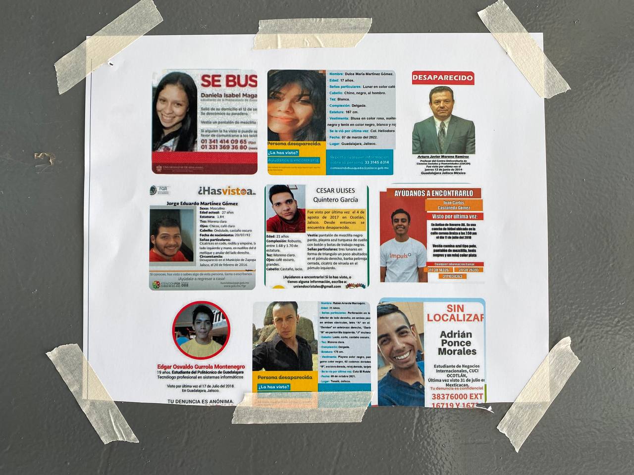 En nuevo intento por llamar la atención de las personas convocadas a marchar colocaron las lonas con los rostros de sus hijos, hijas y seres queridos desaparecidos en el piso, justo al llegar a la Catedral de Guadalajara. Y, si bien, algunas miradas se volvieron hacia ellas, lo cierto es que otros asistentes pasaron por encima de las fotografías ignorando lo que éstas significan para las familias.
