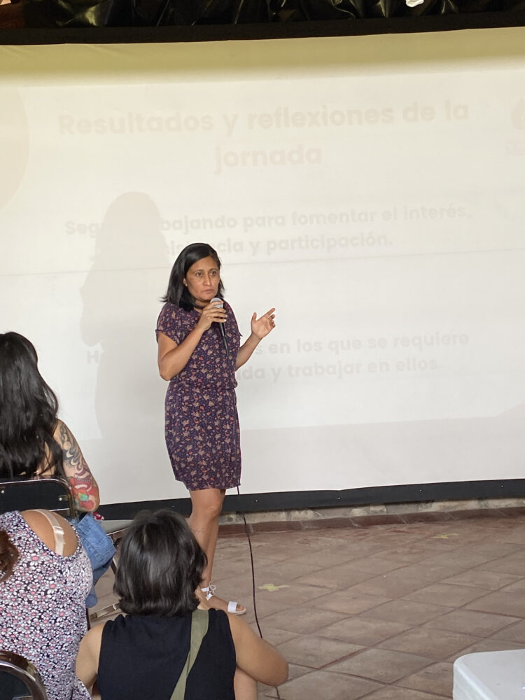 Karina Bello, en representación de Mujeres de Madeni en México presentó los resultados de la estrategia pedagógica Prejuicios Basura, la cual recupera más de 120 ideas y expresiones que muestran lo más absurdo que las mujeres hemos escuchado sobre la menstruación, para posteriormente despojarse de ellas mediante un acto simbólico que implica, literalmente, tirar a la basura todas esas narrativas asociadas a representaciones negativas, misóginas y violentas que se han aprendido de la sociedad a través de los años.