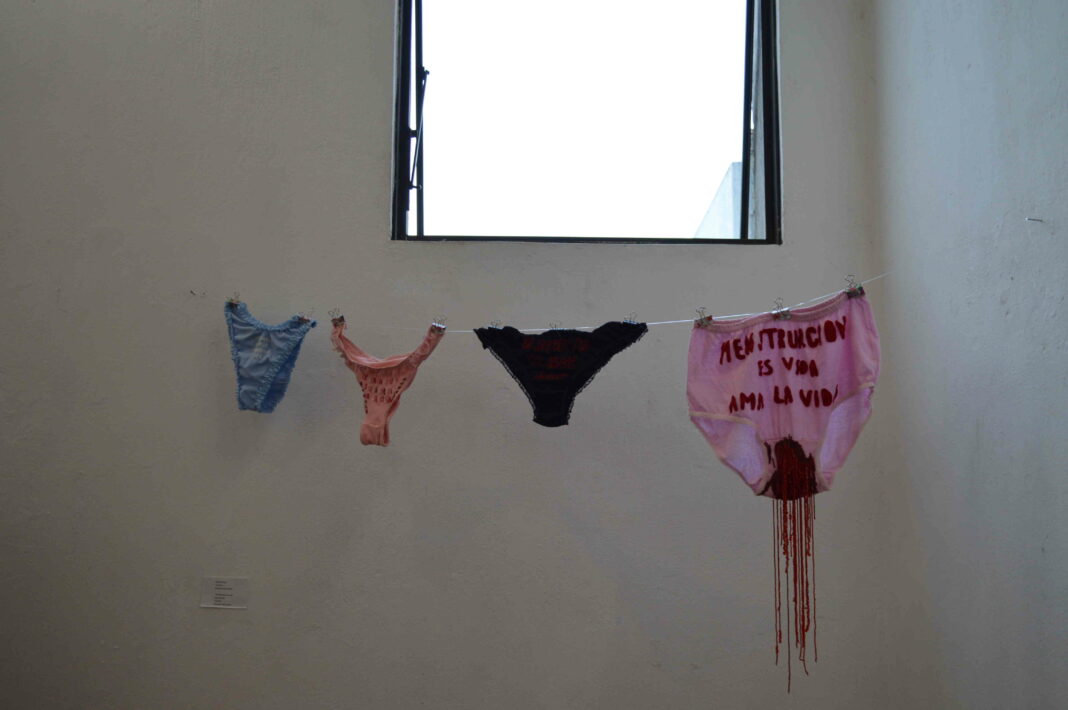 La muestra integra más de 20 piezas, entre las cuales está el trabajo de Katia Sheilita, artista de Colima, quien explora a través del bordado el tema de la menstruación.