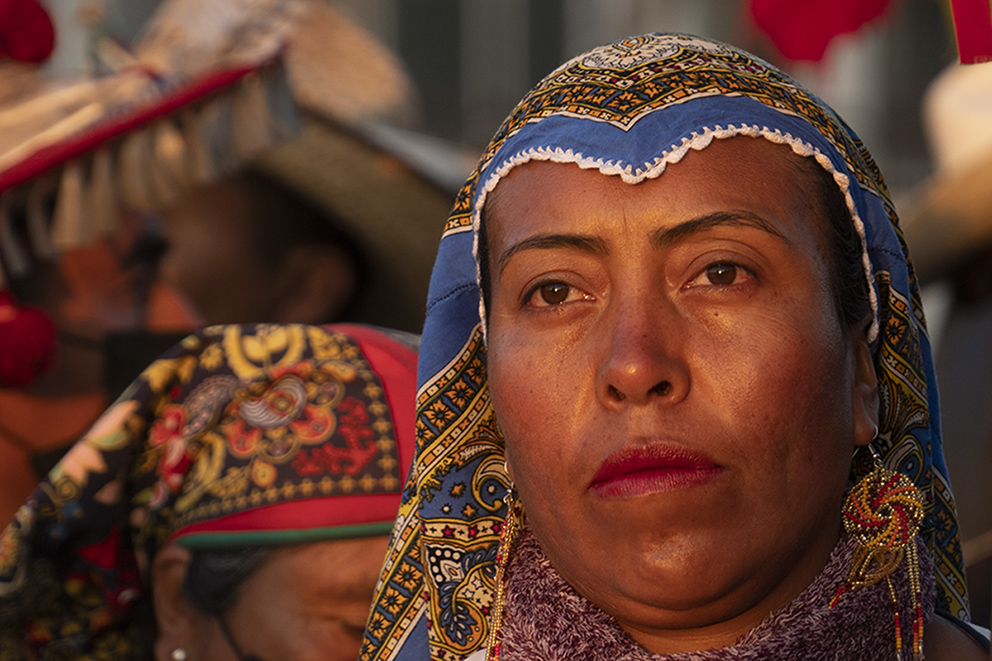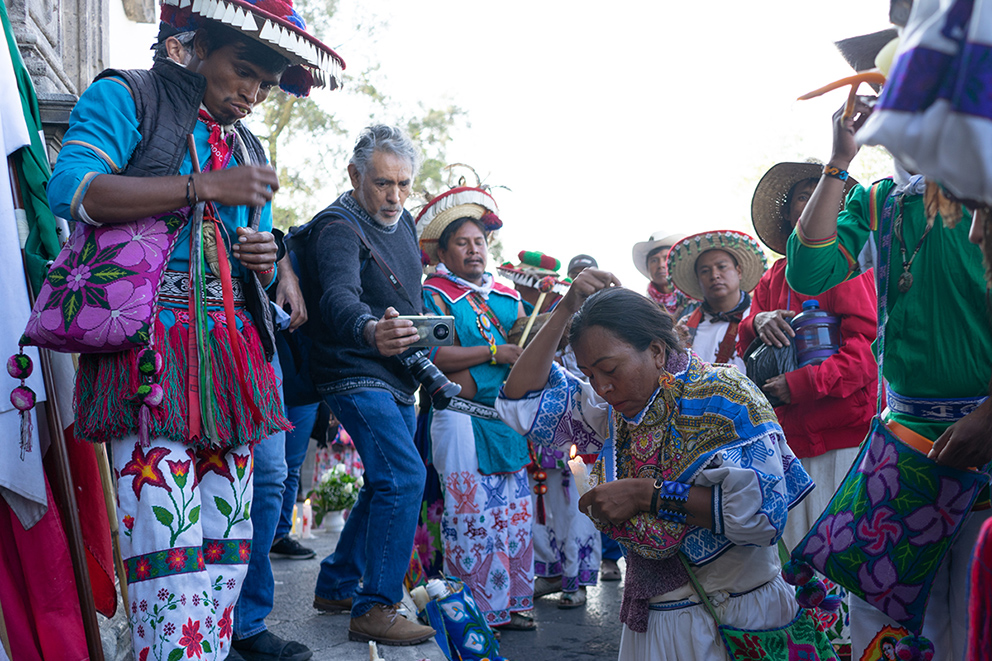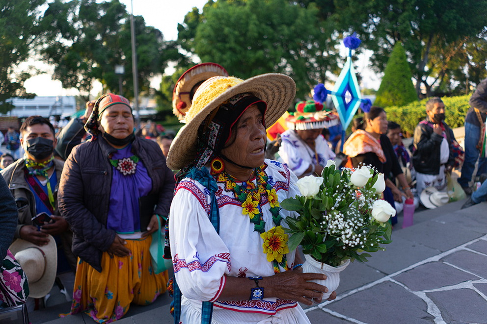 Cae de las manos de Luciana Mijares el maíz tostado en la ofrenda, está al frente del templo y hace distintos tipos de rezos en su propia lengua frente a los altares. Con 60 años, es una mujer integrante del Consejo de Ancianos del pueblo Wixárika. Caminó desde San Sebastián Teponahuaxtlán, su pueblo, en huaraches, con su morral amarillo de flores rosas y moradas. Cuenta: