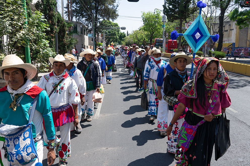 Al bajar del cerro del Tepeyac, quienes inician la caminata por la restitución de sus tierras son las mujeres. Van al frente con banderas que ondean con el viento de la cima del cerro del Tepeyac, donde realizaron una ceremonia al amanecer. El marakame va justo detrás de ellas, tiene en su morral la piel y cuernos de venado, porta un atuendo blanco con venados morados y lilas todos andan en sandalias. Porta un bastón con una serpiente.