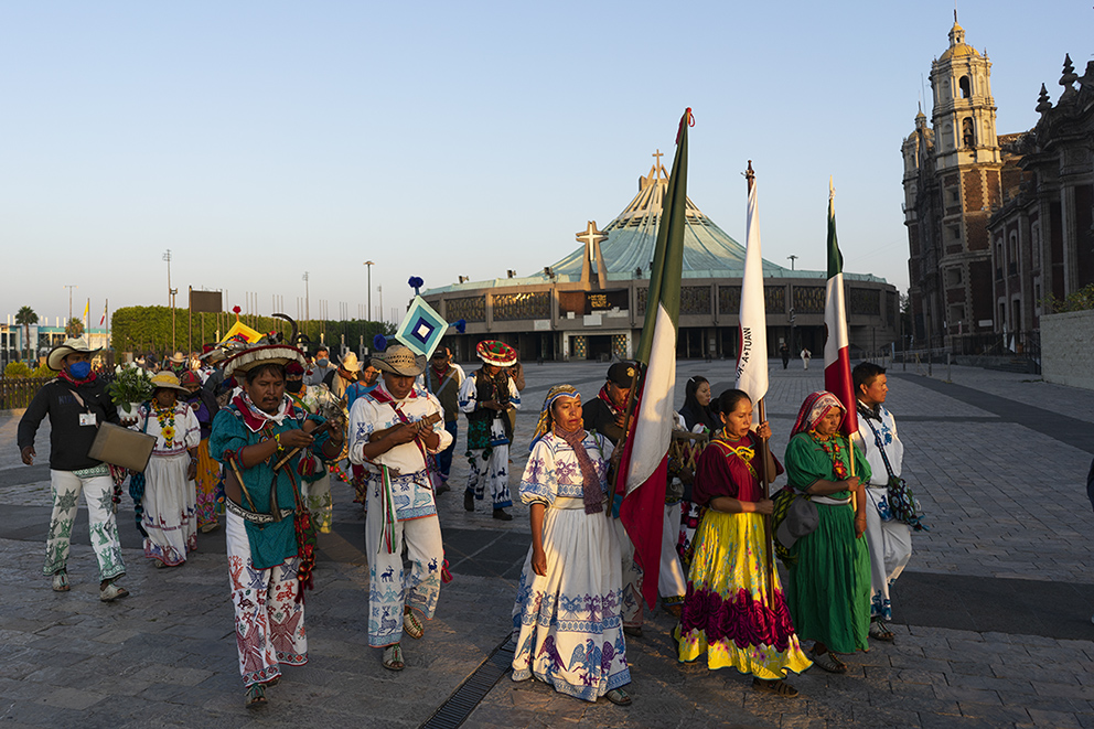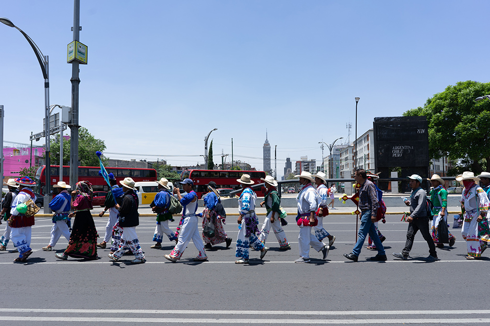 Desde que salen de la basílica, se les acercan los paseantes y visitantes que vienen también de fuera a rezar. Les preguntan de donde son, los ven tan coloridos que se les acercan mientras danzan mientras caminan. “Somos del sur de Jalisco” responden algunos. Otros les dicen que vienen a hacer una ofrenda y a luchar por la tierra. Los paseantes les toman fotos como si estuvieran en un espectáculo y sin embargo los wixarika danzan, o caminan.