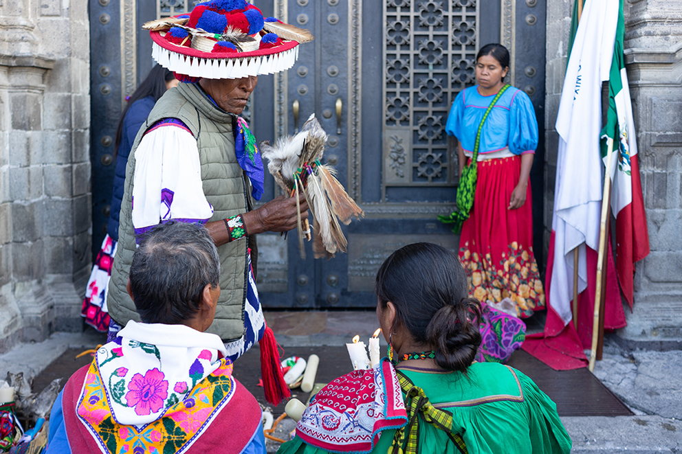 Con plumas de águilas, hacen volar el agua bendita sobre los objetos sagrados, sobre la ofrenda que trajeron caminando desde sus pueblos y sobre los cuerpos de las y los caminantes. A lo largo de 32 días realizaron día y noche una ceremonia. Sus caminatas iniciaron a las 11 del día pues les guía el sol.