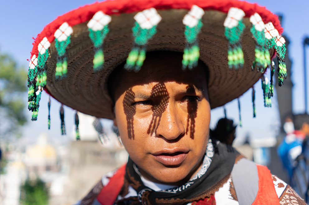 Los huaraches la hacen de percusiones que retumban en el suelo de este cerro, donde detona la danza. Están en plena oración. Son los mismos huaraches de mujeres y hombres wixaritari que caminaron más de mil kilómetros para exigir la restitución de sus tierras invadidas. Son más de 11 mil hectáreas. Poco a poco quienes están alrededor de este semicírculo danzan lentamente, uno por uno, como si se fuera contagiando. La música sube de volumen mientras amanece con el gris de los edificios de la ciudad de fondo.