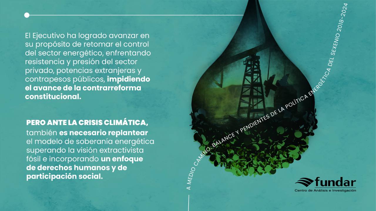 “A medio camino. Balance y pendientes de la política energética del sexenio 2018-2024” es un informe de investigación realizado por los Programas de Territorio, Derechos y Desarrolllo y Justicia Fiscal de FUNDAR, Centro de Análisis e Investigación (FUNDAR), en éste se hace un balance de la política energética de la administración de Andrés Manuel López Obrador durante la primera mitad de su sexenio.