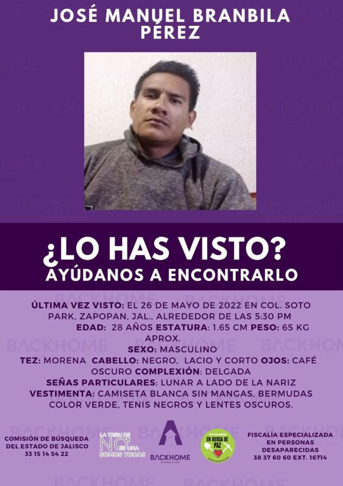 José Manuel Branbila Pérez, de 28 años, fue desaparecido el 26 de mayo de 2022 en la colonia Soto Park, en Zapopan, Jalisco, cuando salió a entregar en su motocicleta un pedido del mini súper en el que trabaja.