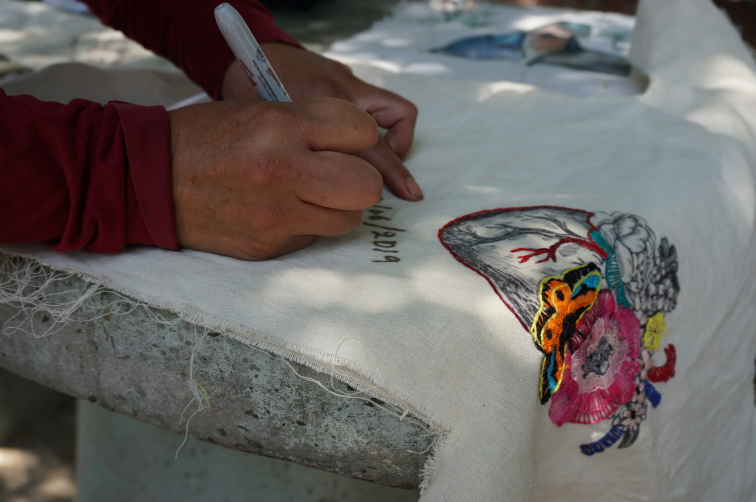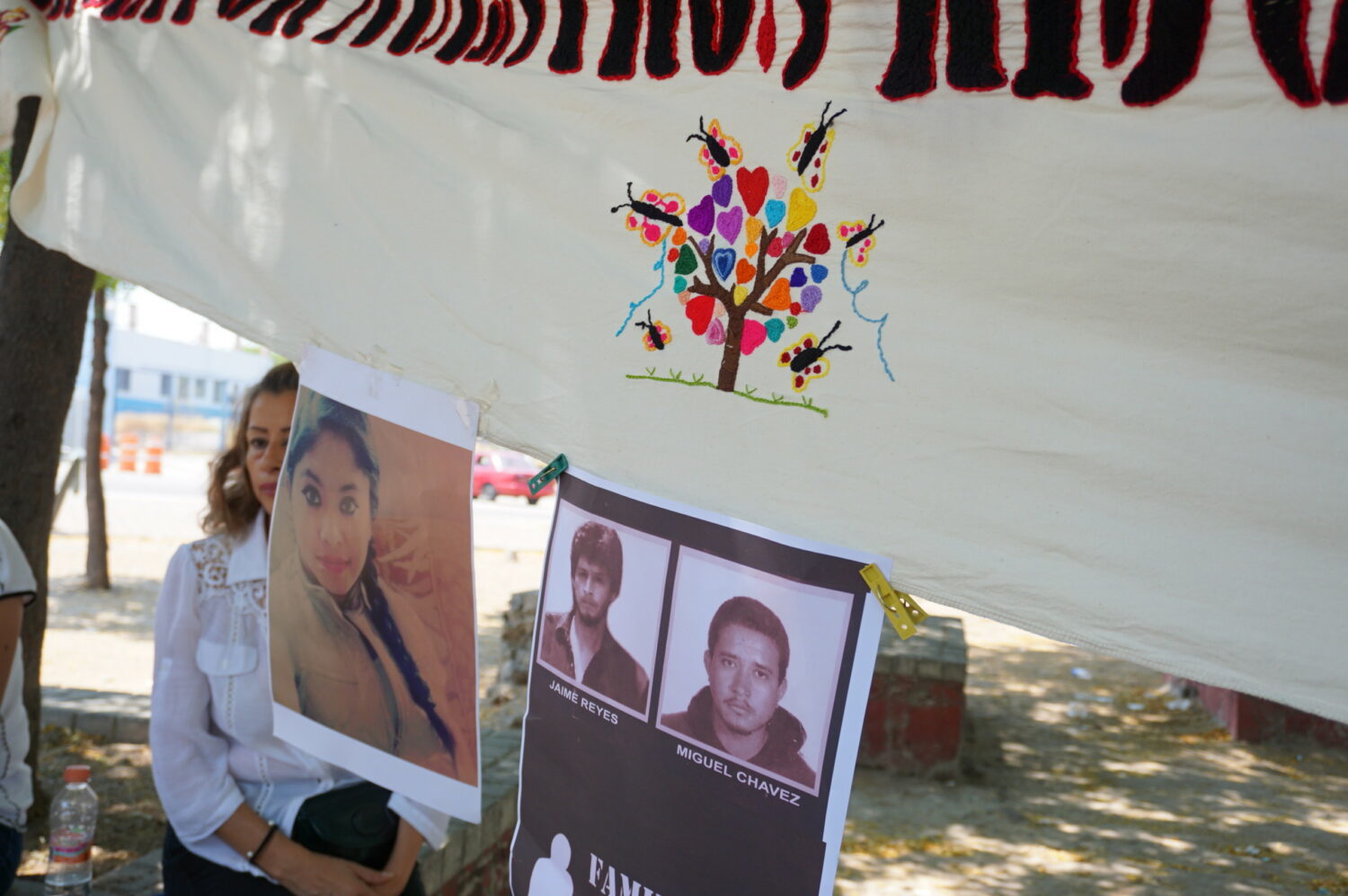En la espera de ser atendidas, las familias bordaron y escribieron mensajes a sus seres queridos en una manta con forma de un cuerpo humano, la cual tiene en el costado izquierdo un corazón con flores. La acción es una las muestras artísticas que realizan al interior del colectivo.