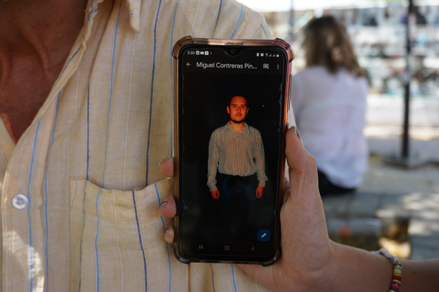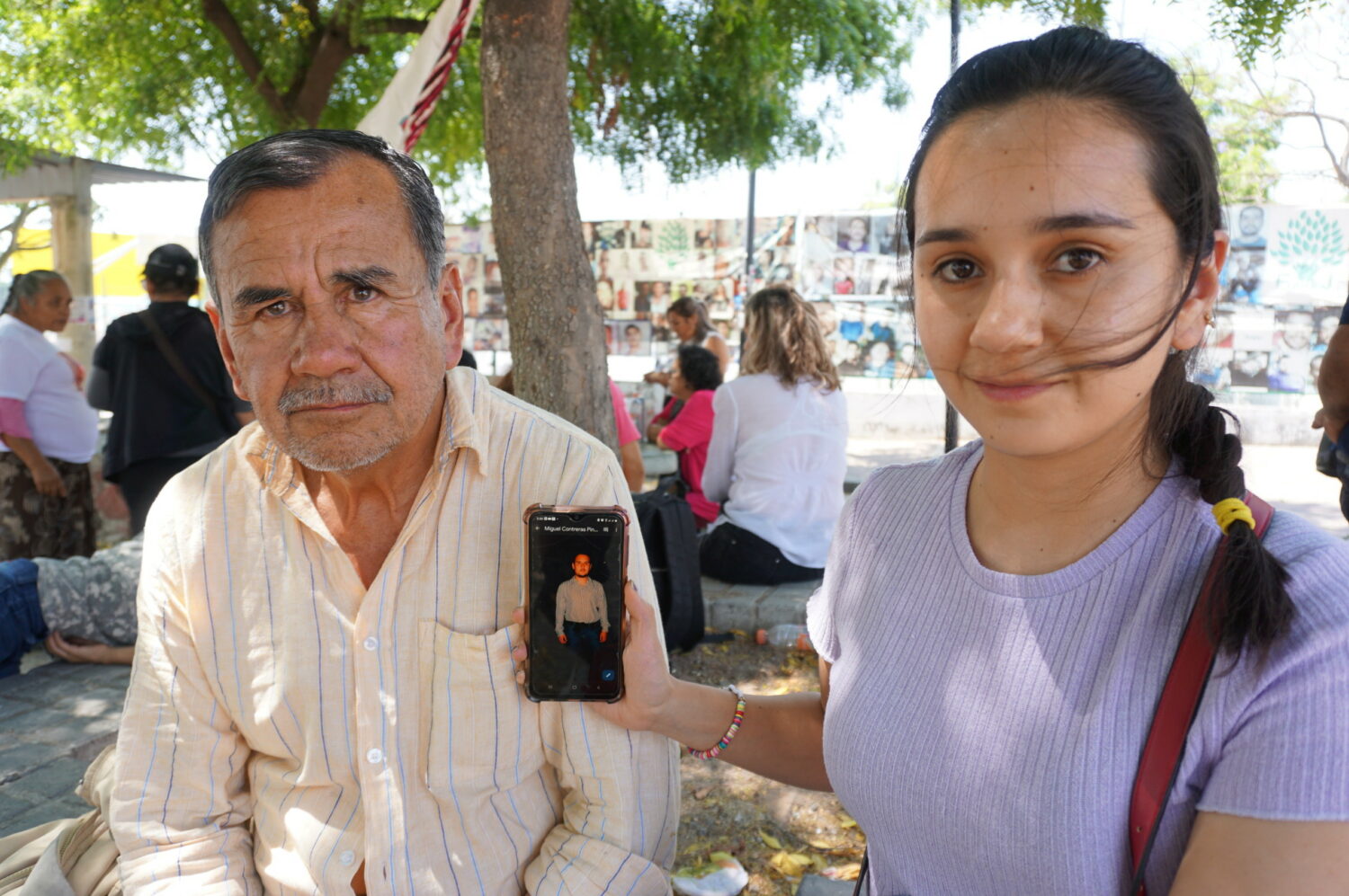 Erika Contreras junto a su padre, sostiene con sus manos su celular con la fotografía de su hermano desaparecido Miguel Contreras Pineda.