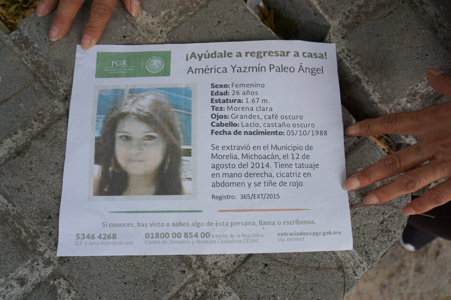 Valery tiene 14 años y busca a América Yazmin Paleo Ángel. Estudia el tercer grado de la secundaria y dice que esta es la primera vez que acude a realizar una búsqueda para encontrar a su mamá, a quien poco recuerda, pues tenía apenas 7 años cuando le vio por última vez.