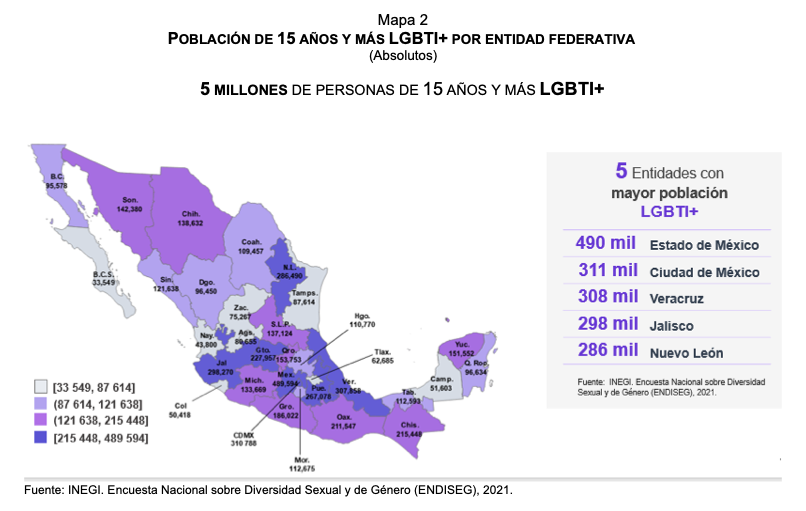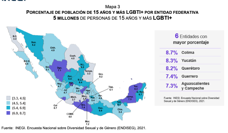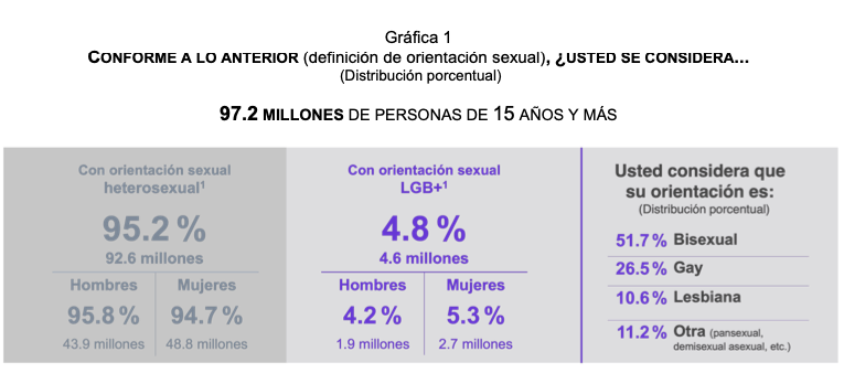 El dato más significativo es que en México 1 de cada 20 personas de 15 años o más se autoidentifican como parte Comunidad LGBTI+, esto significa que 5 millones de personas en el país tienen una orientación sexual y/o identidad de género diversa, lo que representa al 5.1% de toda la población.