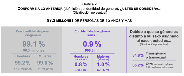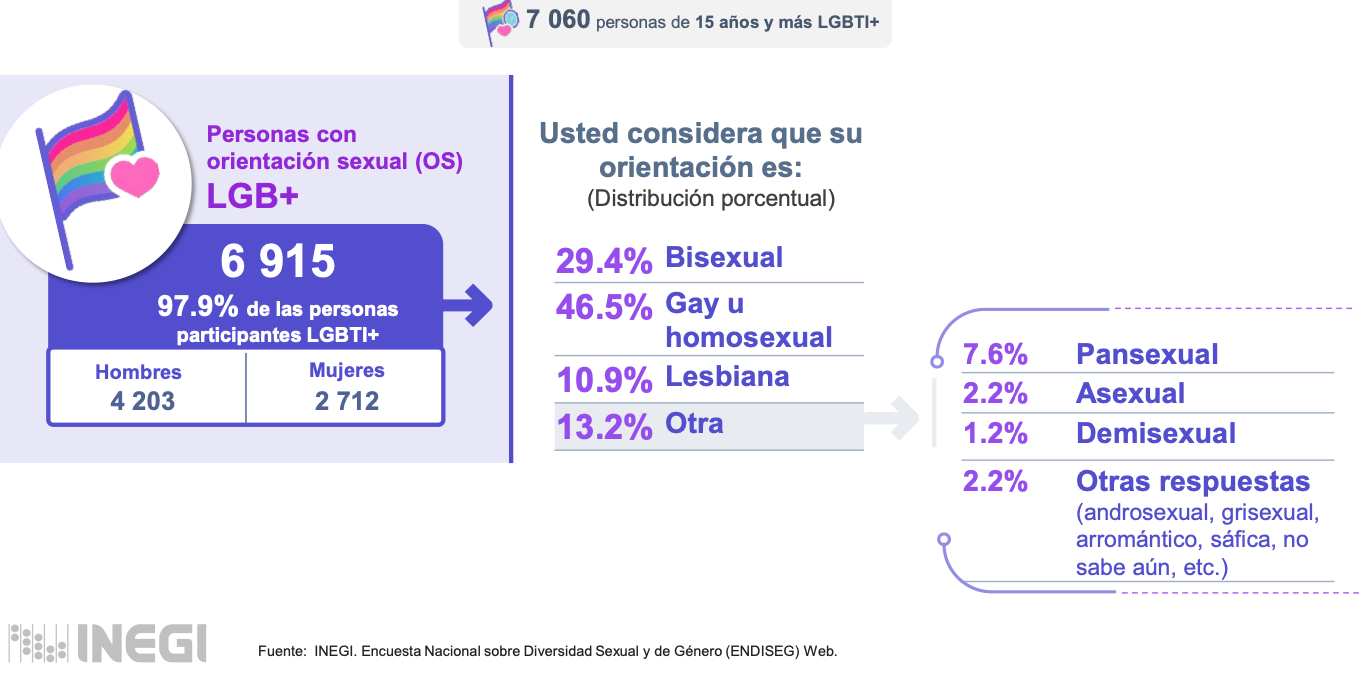 De manera general, la ENDISEG señala que de las 5 millones de personas que se autoidentifican como parte de la Comunidad LGBTI+, 4.6 millones de personas (el 81.8%) lo es por su orientación sexual, 908 mil por su identidad de género (7.6%) y el 10.6% por ambas.