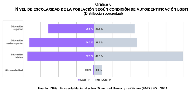 Lo que también resalta la ENDISEG es que pese a esta diversidad, “el 90% de las personas LGBTI+ no recibió algún tipo de asesoramiento/educación sexual”, esto frente al 77% de las personas No LGBTI+, lo cual evidencia que en temas de educación sexual no permea una mirada integral e interseccional, pues la pedagogía dominante es la binaria y la biológica que están, a su vez, permeadas por la moral católica-cristiana de las y los profesores; así lo precisa de manera clara este reportaje: “La educación sexual en Jalisco: recae en voluntades personales”.