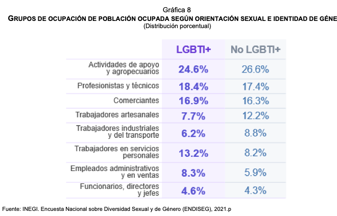Entre quienes trabajan, la ENDISEG destaca que el 24.6% de la población LGBTI+ encuestada trabaja en actividades de apoyo y agropecuarias; el 18.4% son profesionistas o técnicos; el 16.9% son comerciantes, y el 13.2% prestan servicios personales.