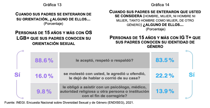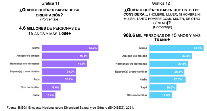 Saber esto para INEGI era importante porque permitía identificar sus redes de apoyo al momento de hablar sobre su orientación o identidad; en ese sentido, fueron las madres su primer pilar, seguidos de amigos y/ o amigas y, en tercer lugar, hermanas y/ o hermanos.