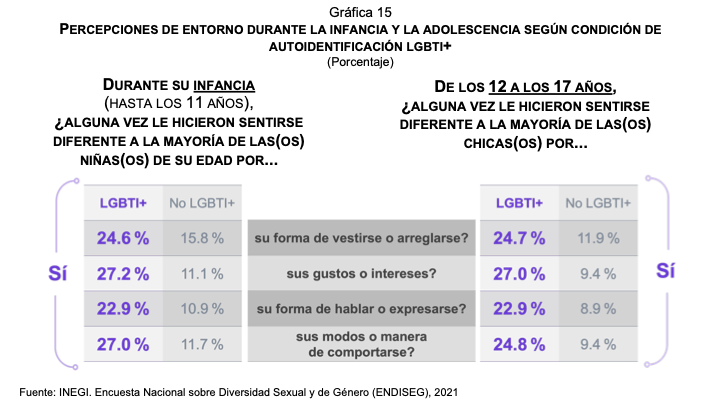Además, la ENDISEG también indagó sobre otras formas de violencia percibidas ya sea por su forma de vestir y expresarse, gustos o modos de comportamiento; ahí encontraron que la población cisgénero les hizo sentirse diferentes sobre todo durante su infancia y adolescencia.