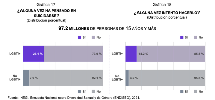 Uno de los datos más preocupantes de la encuesta, es que 1.4 millones de personas de la comunidad LGBTI+ reportó que han pensado en suicidarse (26.1%) o ya lo han intentado, al menos, una vez (14.2%), porcentajes que triplican las veces que una persona No LGBTI+ lo ha pensado y/o realizado.