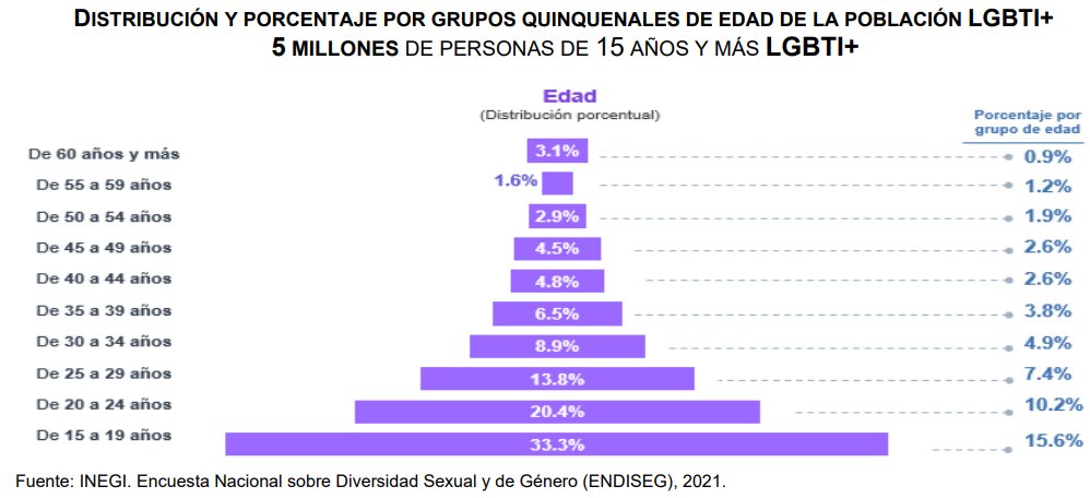 Sus palabras, de manera específica, hacían referencia a que de las cinco millones de personas que se identificaron como parte de la comunidad LGBTI+, el 15.6% fueron adolescentes y jóvenes entre los 15 y 19 años; un dato muy relevante si se toma en consideración que el 43.4 % de las, les y los entrevistados también señalaron que fue en la primera infancia (antes de los 7 años) cuando se identificaron con su orientación sexual; particularmente, esto sucede con más frecuencia con las personas trans, pues el 62.4% supo de su identidad de género antes de los 7 años.