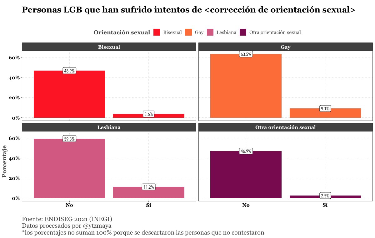 Activistas como Ytzel Maya alertó en la importancia de diversificar más los datos, algo que ella realizó para evidenciar que: “Las mujeres lesbianas han sufrido más intentos por parte de sus padres de corregir su orientación sexual (el 11.2%), seguidas de los hombres gays”.