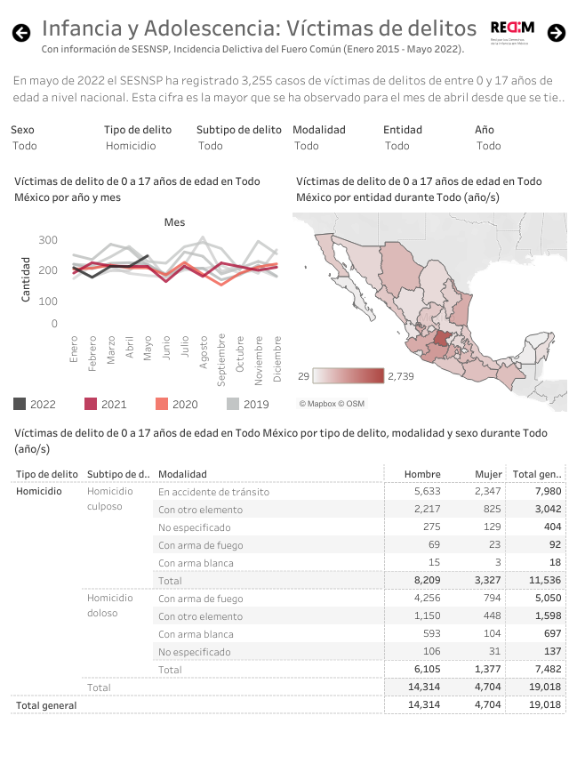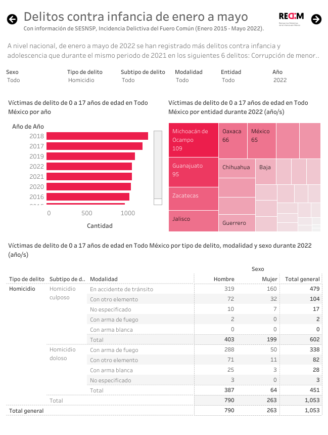 “entre enero de 2015 y mayo de 2022 se reportaron 7,482 homicidios dolosos de personas de entre 0 y 17 años; siendo 1,377 mujeres y 6,105 hombres. En adición, la cantidad de los homicidios dolosos de personas de entre 0 y 17 años registrados en México durante la administración federal actual (de enero de 2019 a mayo de 2022) ascendía a 3,691 a nivel nacional”.