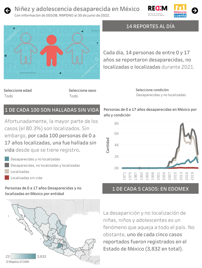Esta terrible realidad, la desaparición de infantes y adolescentes entre 0 y 17 años, se repitió en el primer semestre de 2022 en 2 mil 590 ocasiones; es decir, en los 185 días que transcurrieron del 1 de enero al 20 de junio se denunciaron, al día, la desaparición de 14 niñas, niños y adolescentes; así lo denunció la Red por los Derechos de la Infancia en México (REDIM), tras analizar los datos reportados en el Registro Nacional de Personas Desaparecidas y No Localizadas de la Secretaria de Gobernación.