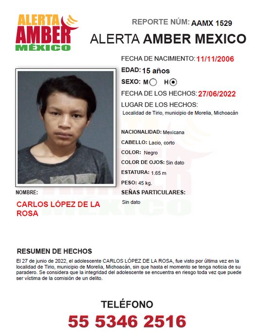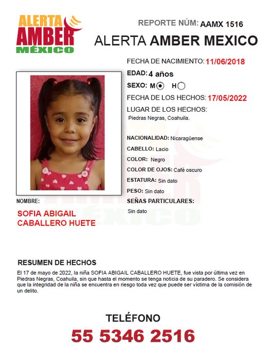 Sofía Abigail Caballero Huete, de 4 años, fue desaparecida el 17 de mayo de 2015 en Piedras Negras, Coahuila; Carlos López De la Rosa, 15 años, también fue desaparecido, pero el 27 de junio de 2022 en la localidad de Tiro en Morelia, Michoacán. Ambos poseen una ficha de búsqueda de Alerta Amber -protocolo especializado en la desaparición de niñas, niños y adolescentes- y ambos, lamentablemente, continúan desaparecidos.