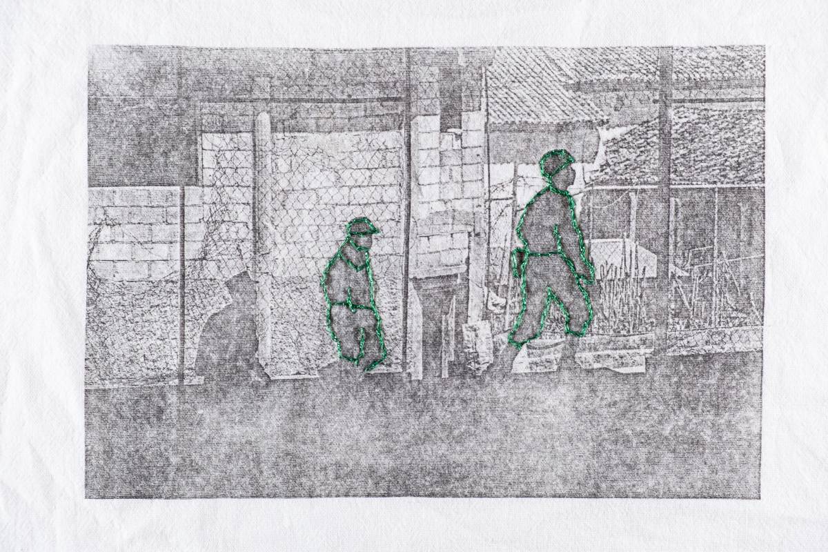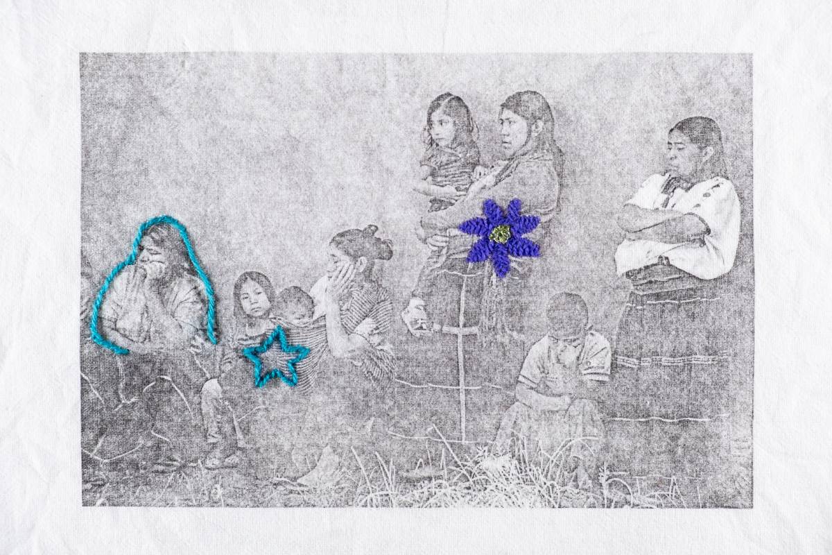 Con hijas e hijos en brazos, bajaron una cuesta hasta llegar al patio de uno de los centros de reunión comunal. Las imágenes impresas que dan cuenta de la historia reciente de Aldama fueron extendidas ante sus ojos: ancianas desplazadas, militares que patrullan la zona, paisajes, telares, cuerpos asustados, cuerpos heridos, casas con impactos de bala. Las mujeres miraron los lienzos, ubicaron algunas caras conocidas pero no reconocieron su identidad y no quisieron ser representadas de esta forma. Tomaron los hilos de colores e intervinieron las imágenes. Al poco, mientras iban ensartando agujas y haciendo puntadas, empezaron a bromear, a reír y soltar carcajadas. La intervención relajó sus cuerpos, iluminó su mente y tornó al ambiente festivo. Pidieron una bebida gaseosa como en los días de celebración.