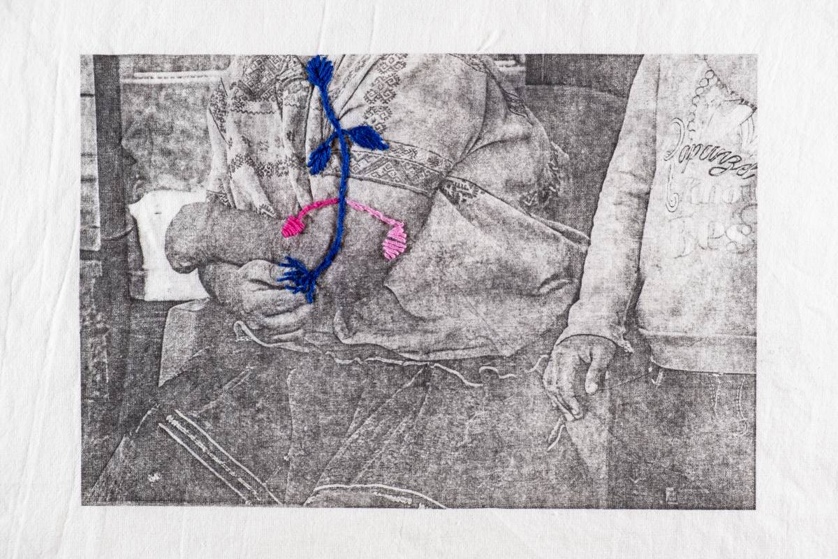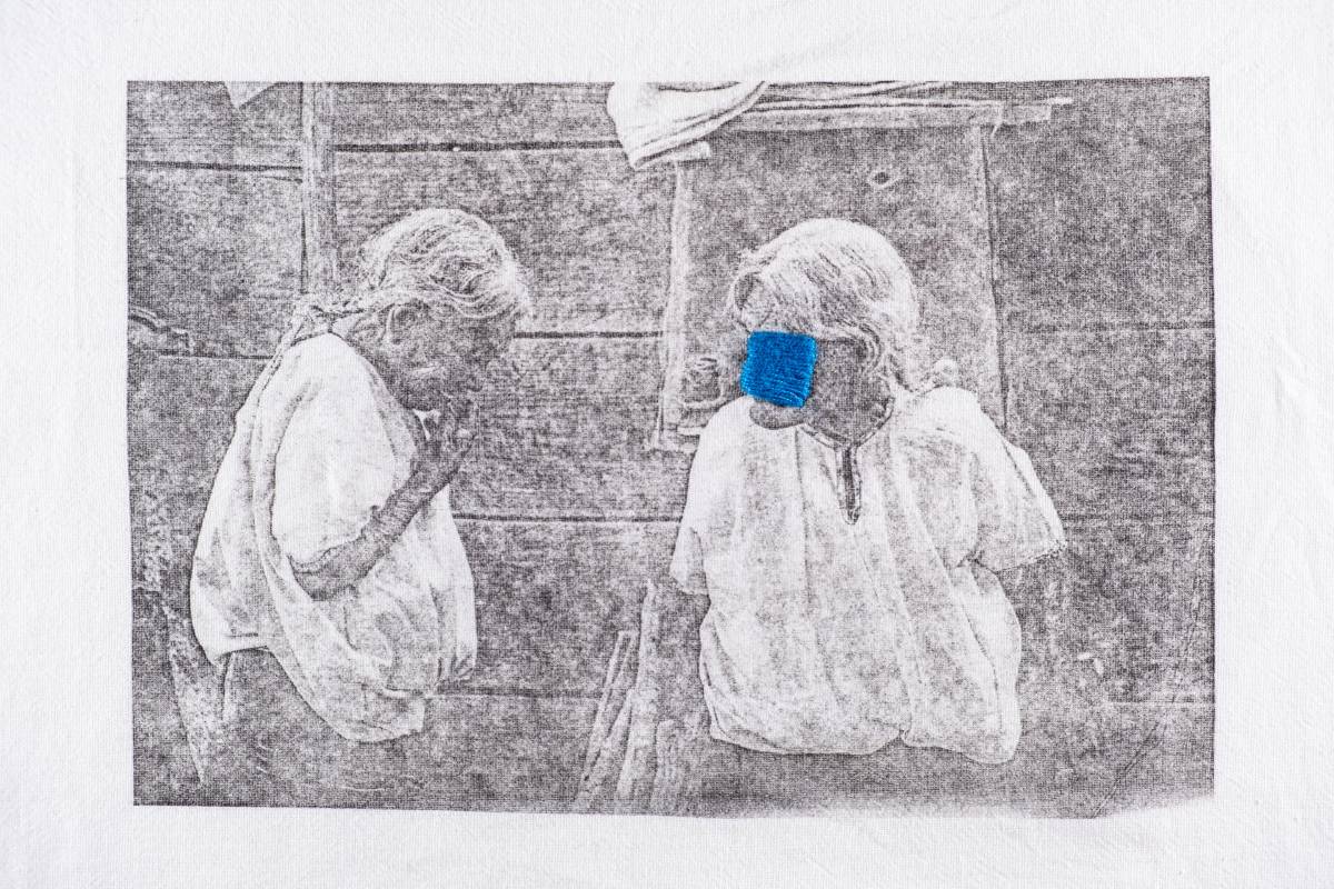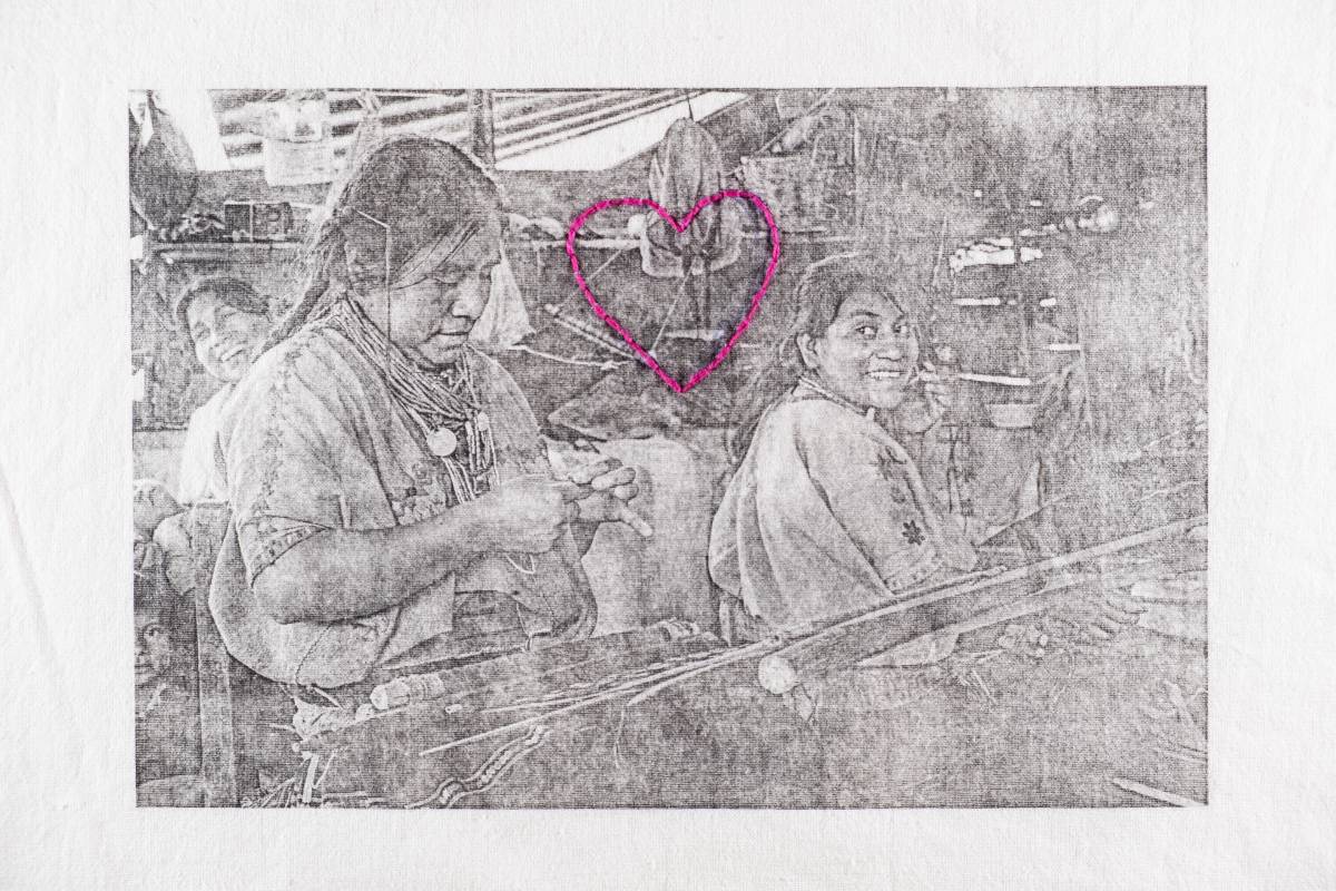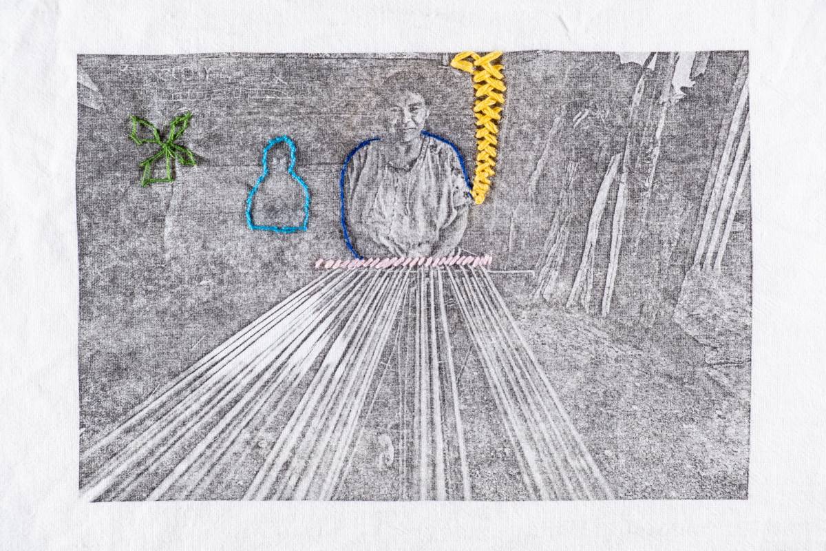 María eligió la imagen de dos ancianas. A una le cubrió el rostro con un recuadro “porque ellas ya no están en sus casas, son desplazadas, dejaron sus casas para escapar de los disparos. Siento tristeza por ellas. La tapo porque hay profunda tristeza”. En otro lienzo, sobre la imagen de una mujer de rostro sereno, bordó un corazón: “el corazón es alegría, felicidad, así me siente hoy”, dijo.