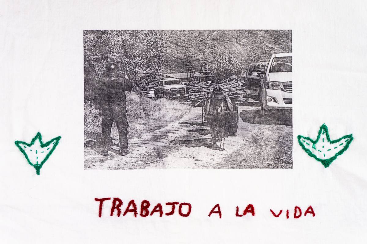 Las acompañaba Tomás, el anciano de la localidad que meses antes fue herido de bala. También Salvador, líder comunero, quien por un momento dejó el radio de comunicación donde reciben mensajes de otros lugares con los reportes de los ataques sufridos, tomó la aguja, los hilos y también se puso a bordar. Salvador quiso explicar su bordado: