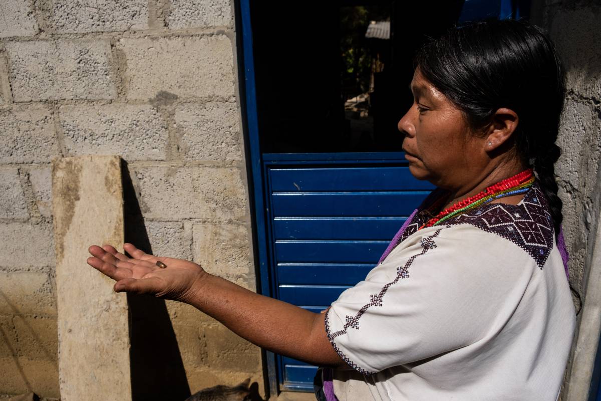 El lugar donde ahora están viviendo es más pequeño que su antiguo lugar y la casa está a medio construir. Pero al menos acá tiene cierta seguridad, “aquí sí ya podemos tejer (…) Ya no tengo más palabras. Sólo quiero que le digan al gobierno, si alcanzan a hablarle, que solucione el conflicto y que le vengan a poner el piso a nuestra casa”.