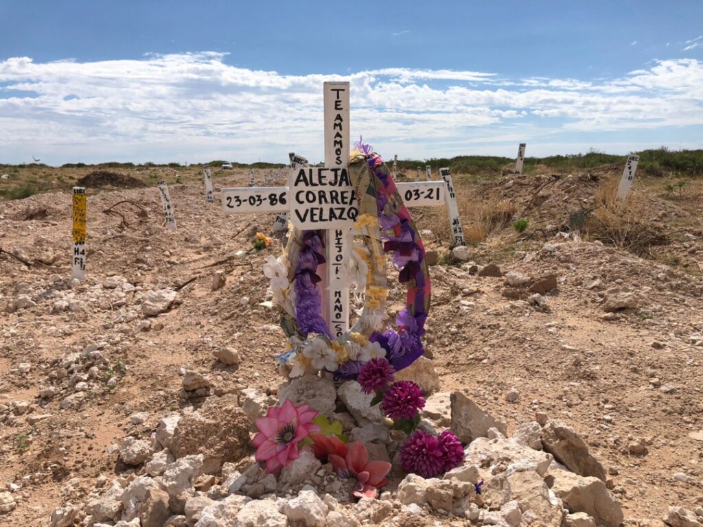 “Te amamos Alejandro Correa Velázquez. Hijo-hermano-sobrino” dice en la cruz blanca de madera que pudo colocar Betty a la tumba en abril pasado, cuando dice que se armó de valor y viajó a Ciudad Juárez para terminar la identificación oficial de su hermano luego de que genética forense encontró coincidencia entre las muestras tomadas a un hijo de Alejandro y un cuerpo.