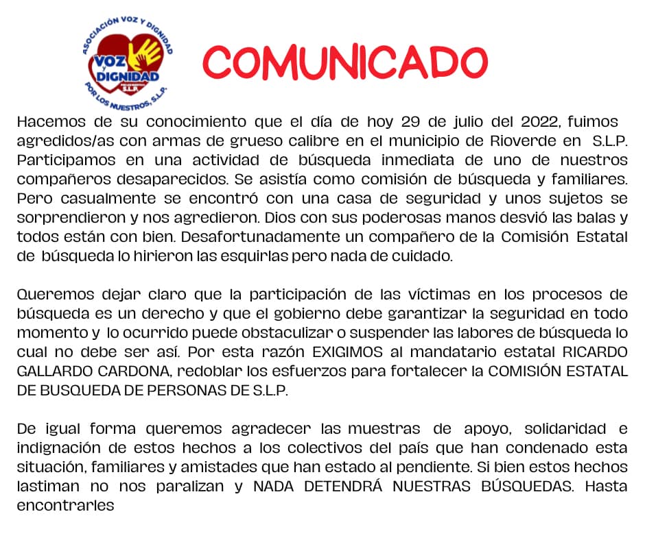 “Queremos dejar claro que la participación de las víctimas en los procesos de búsqueda es un derecho y que el gobierno debe garantizar la seguridad en todo momento y lo ocurrido puede obstaculizar o suspender las labores de búsqueda, lo cual no debe ser así”, dice el comunicado de Voz y Dignidad por los Nuestros, quienes exigen al gobernador Ricardo Gallardo Cardona redoble los esfuerzos para fortalecer la comisión estatal.