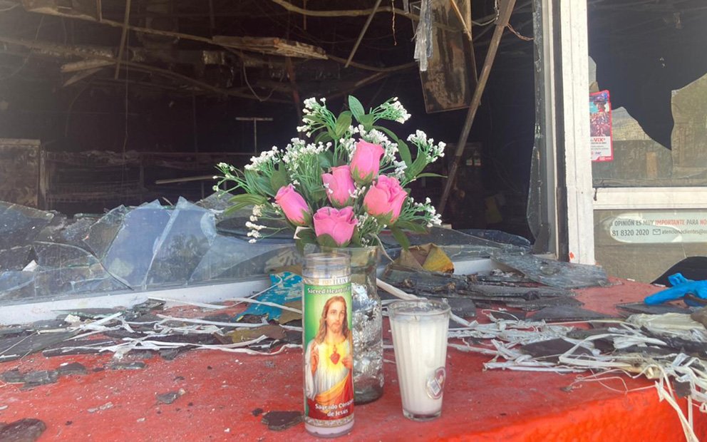 El establecimiento luce oscuro engullido por las cenizas y de su interior aún se percibe el aroma a quemado. El frente de la tienda esta cubierto por restos de vidrio roto de las ventanas donde también los vecinos colocaron cuatro veladoras y ahora un ramo rosas y flor de cal color blanco.